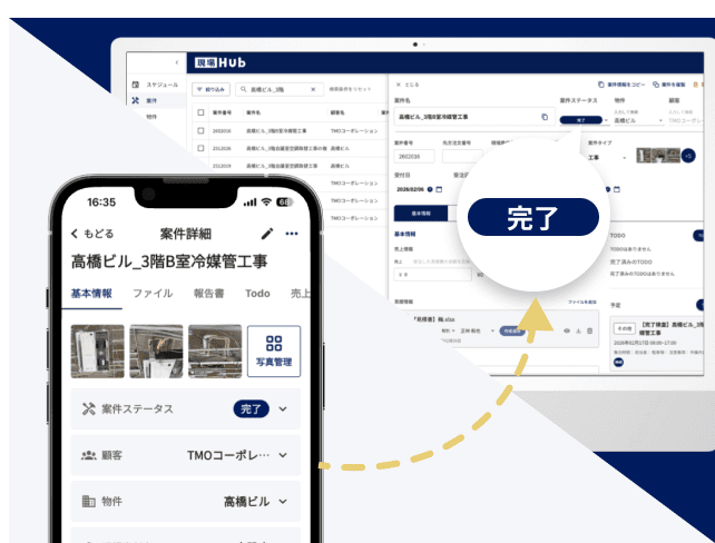 写真、日報、報告書、見積書、請求書、顧客情報、物件情報が全て1箇所に集約