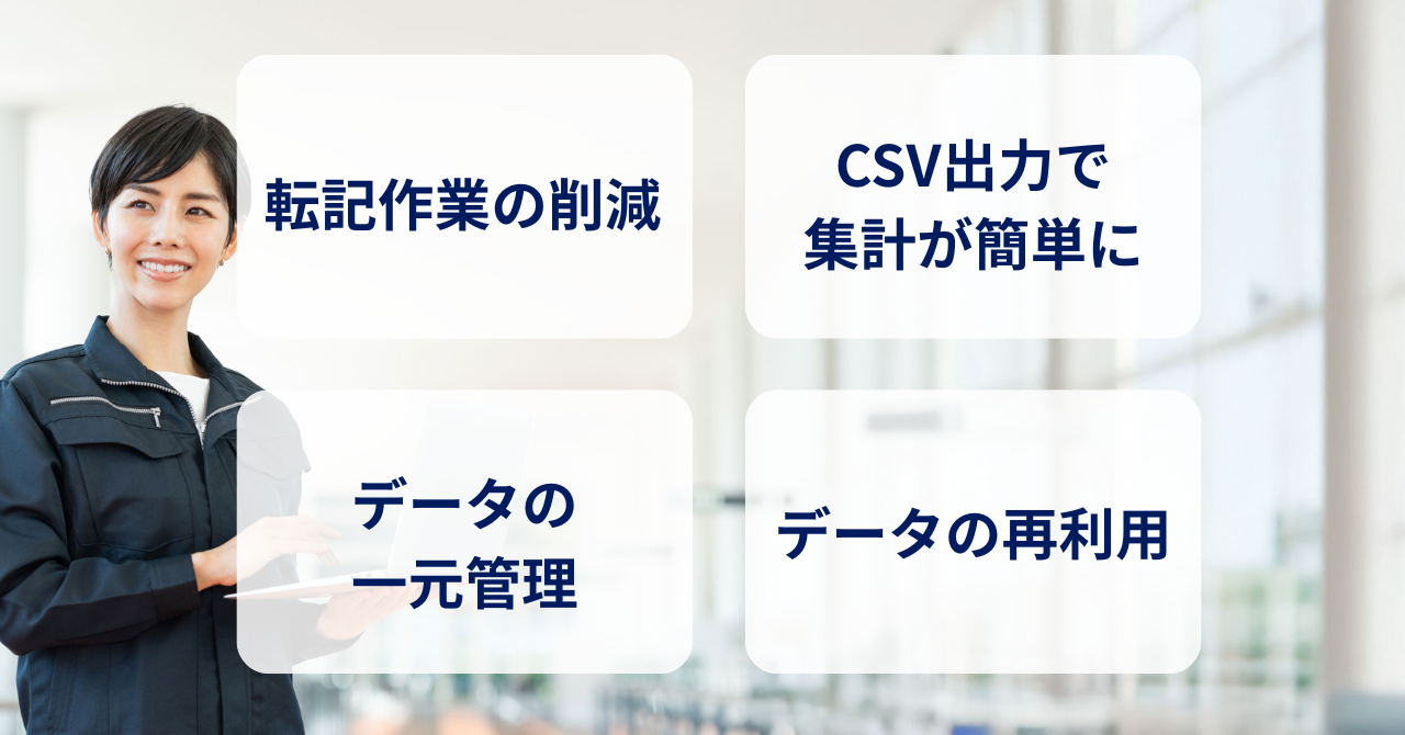 時間削減: 手作業による転記がゼロになり、CSV出力で集計が簡単になります。テンプレート活用により、継続的な効率化が実現します。